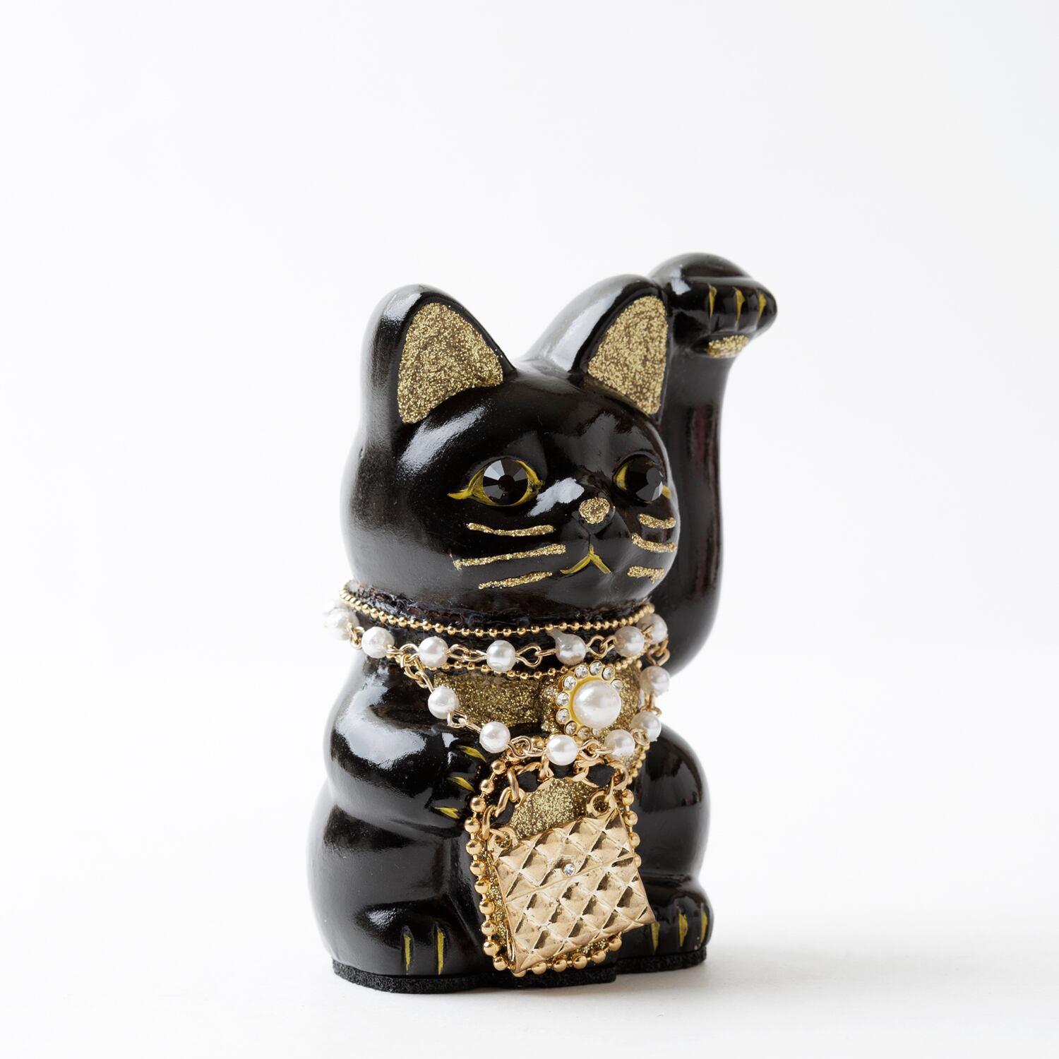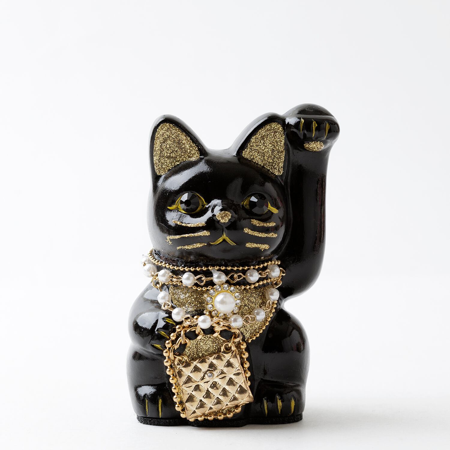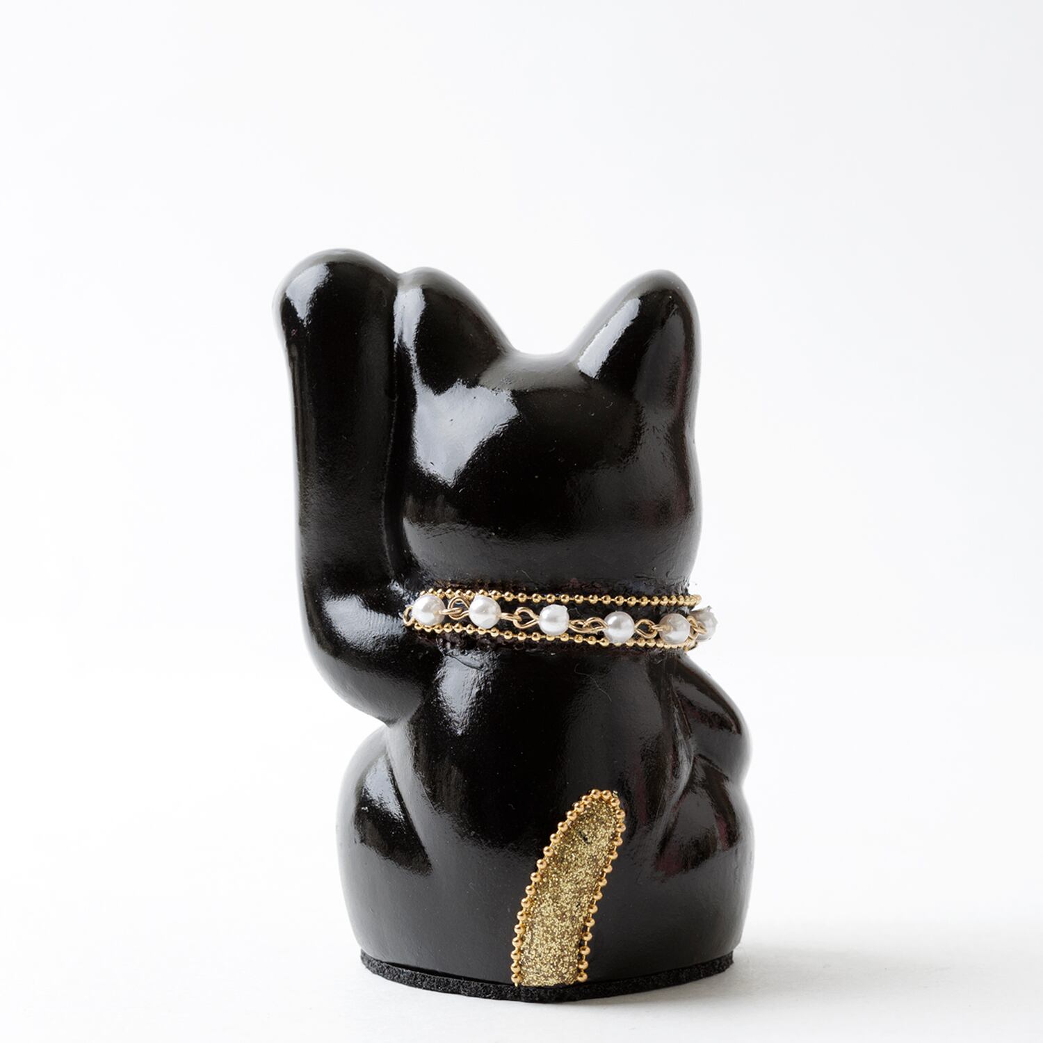 窯元から届く招き猫のベースに、さまざまなテイストのモチーフやパーツを組み合わせて、ひとつずつ、手作業でていねいに仕上げています。表情が若干異なるのも個性だとお考えください。