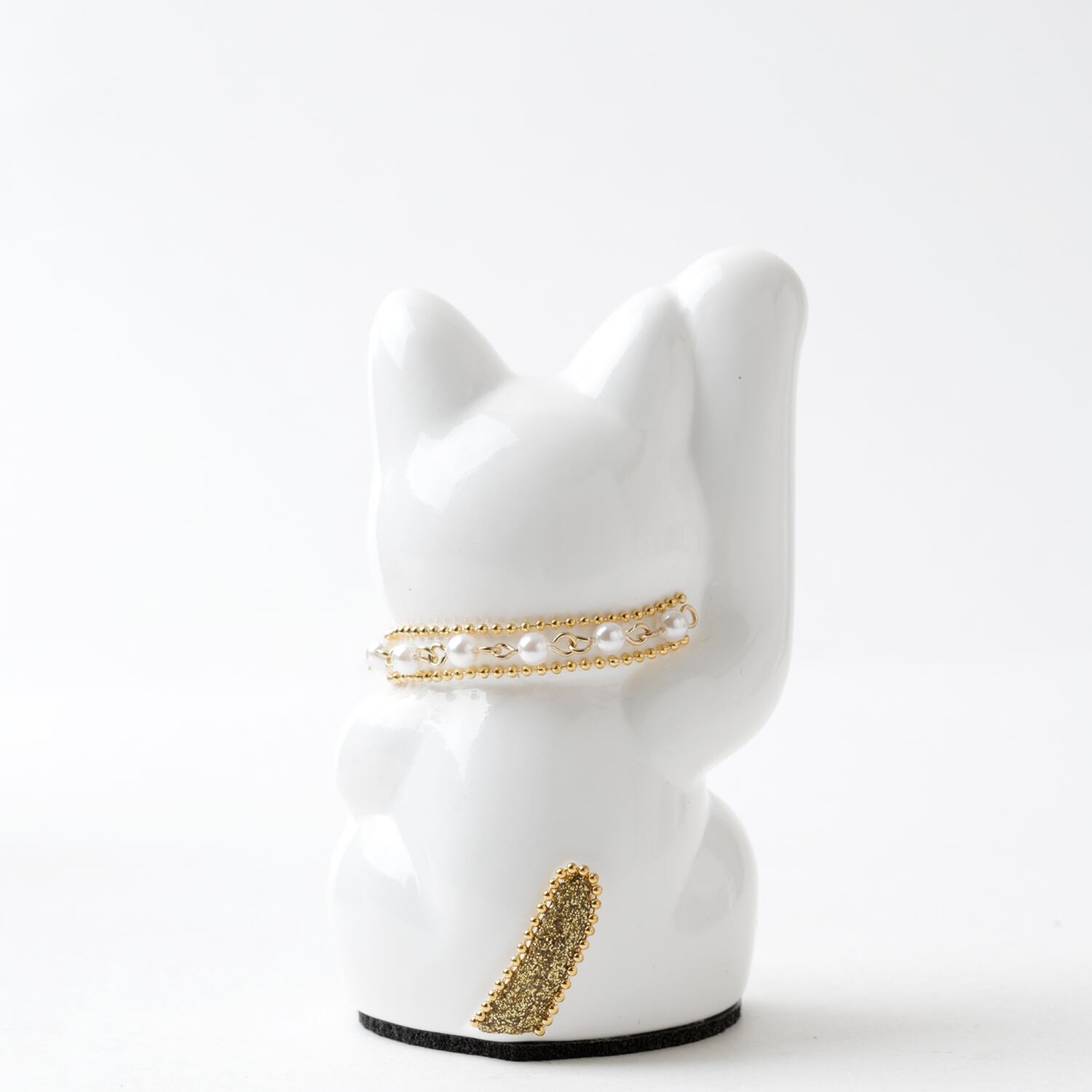 窯元から届く招き猫のベースに、さまざまなテイストのモチーフやパーツを組み合わせて、ひとつずつ、手作業でていねいに仕上げています。表情が若干異なるのも個性だとお考えください。