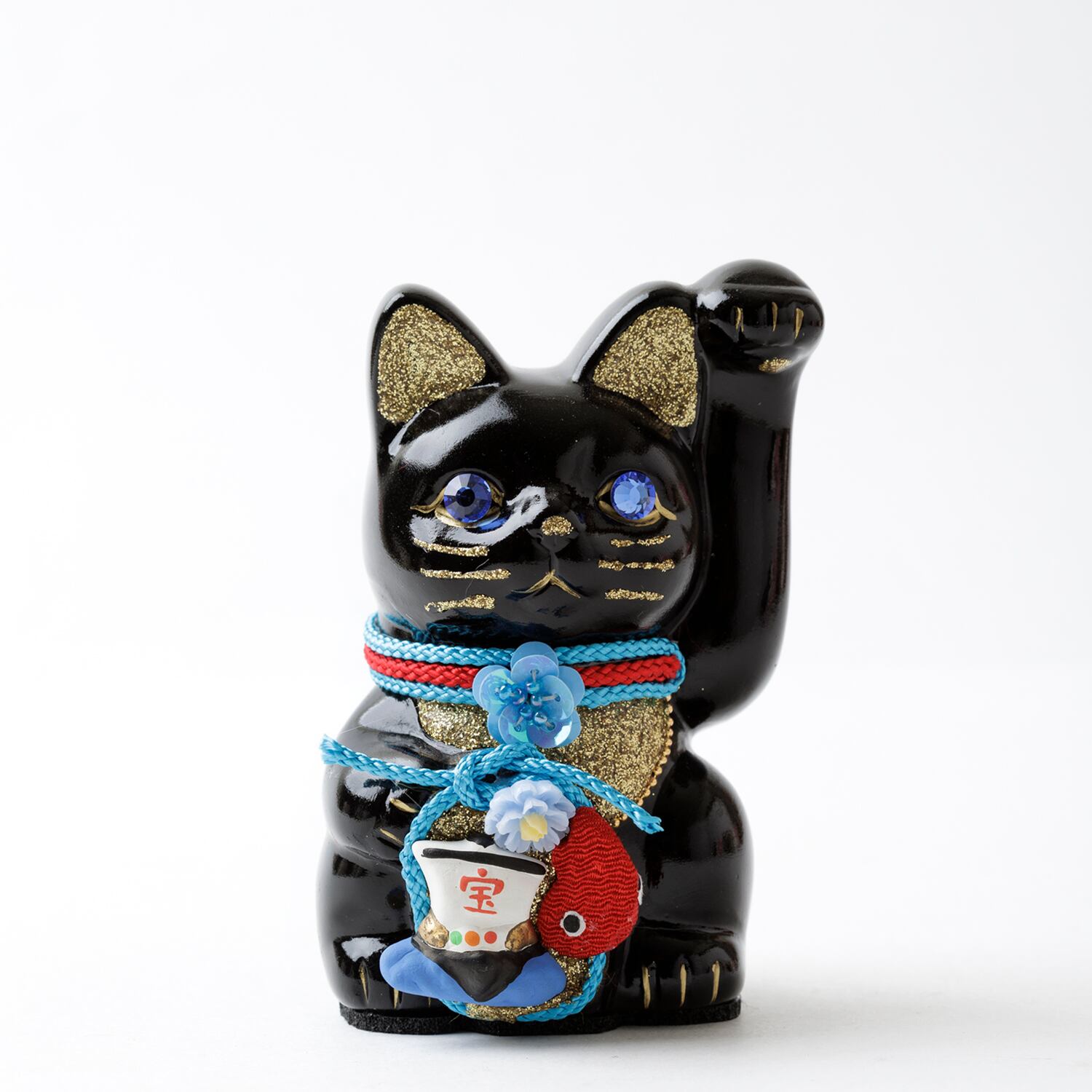 窯元から届く招き猫のベースに、さまざまなテイストのモチーフやパーツを組み合わせて、ひとつずつ、手作業でていねいに仕上げています。表情が若干異なるのも個性だとお考えください。