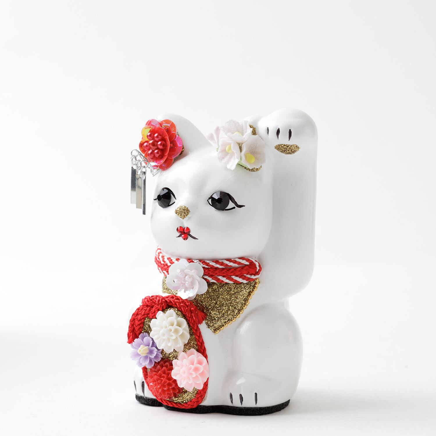 窯元から届く招き猫のベースに、さまざまなテイストのモチーフやパーツを組み合わせて、ひとつずつ、手作業でていねいに仕上げています。表情が若干異なるのも個性だとお考えください。
