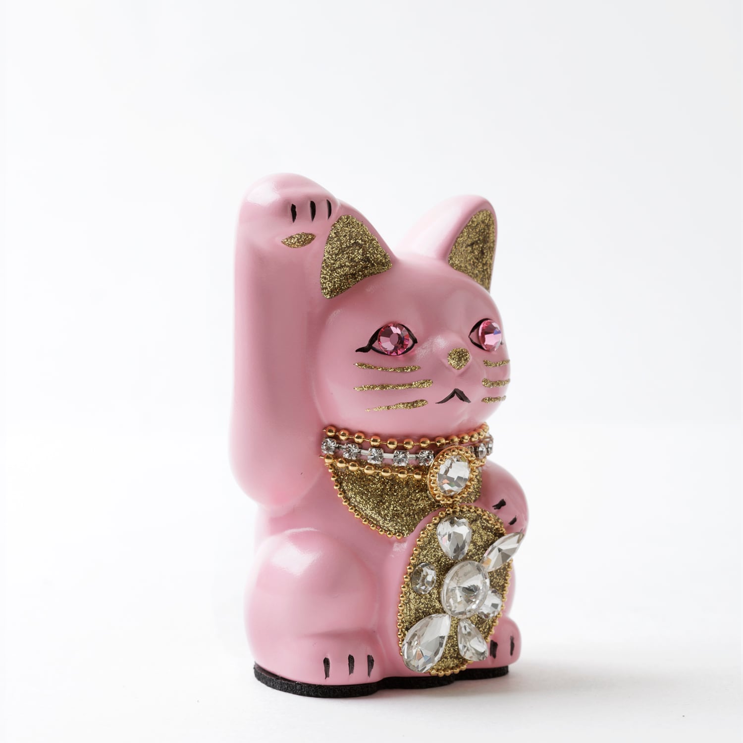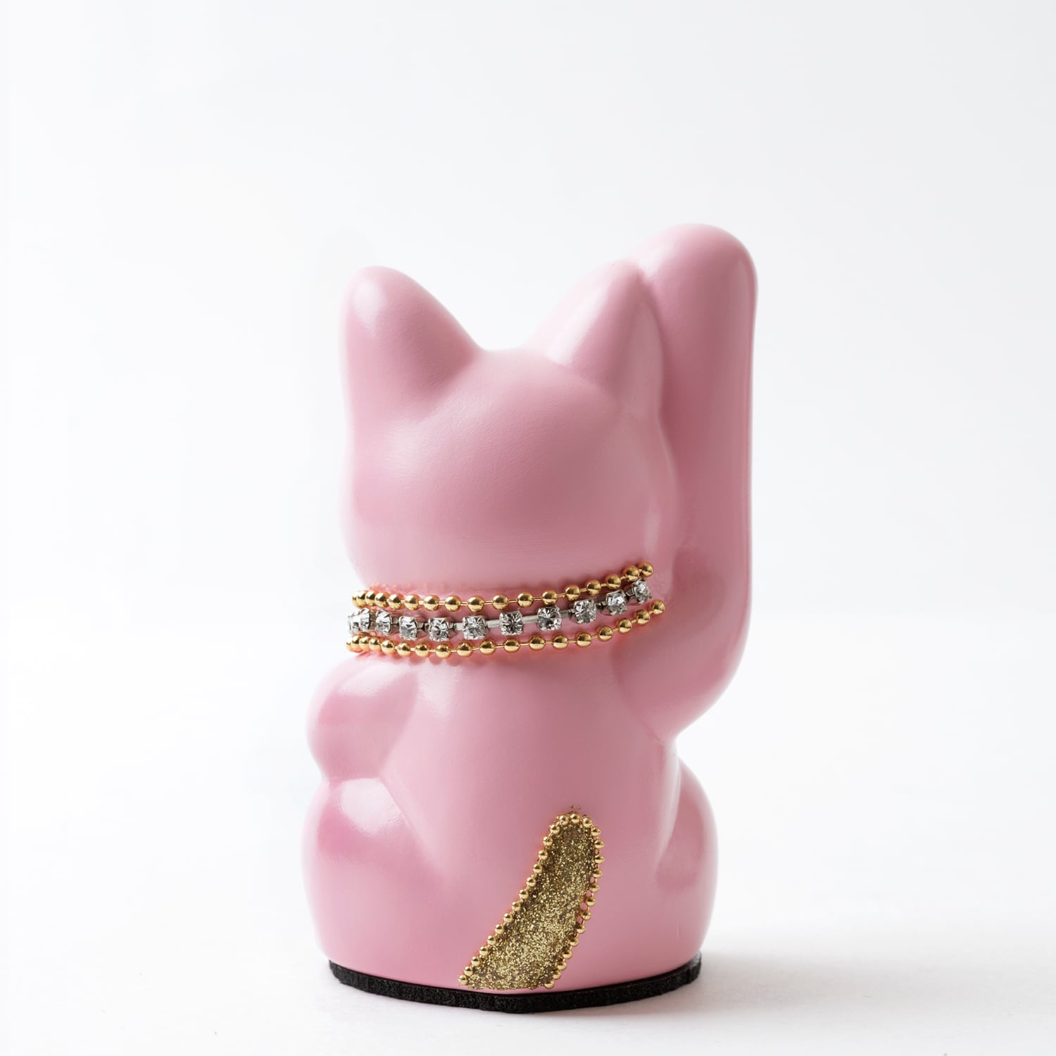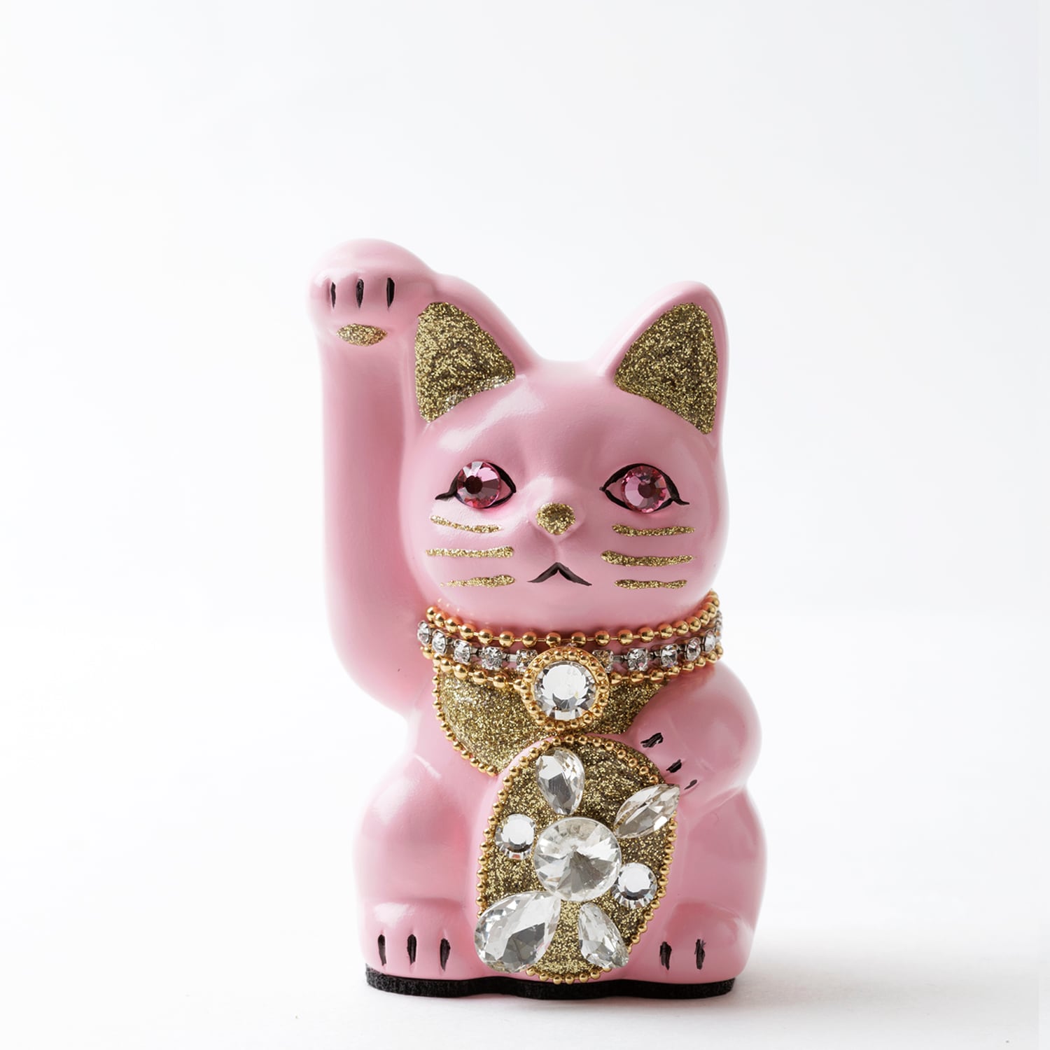 窯元から届く招き猫のベースに、さまざまなテイストのモチーフやパーツを組み合わせて、ひとつずつ、手作業でていねいに仕上げています。表情が若干異なるのも個性だとお考えください。