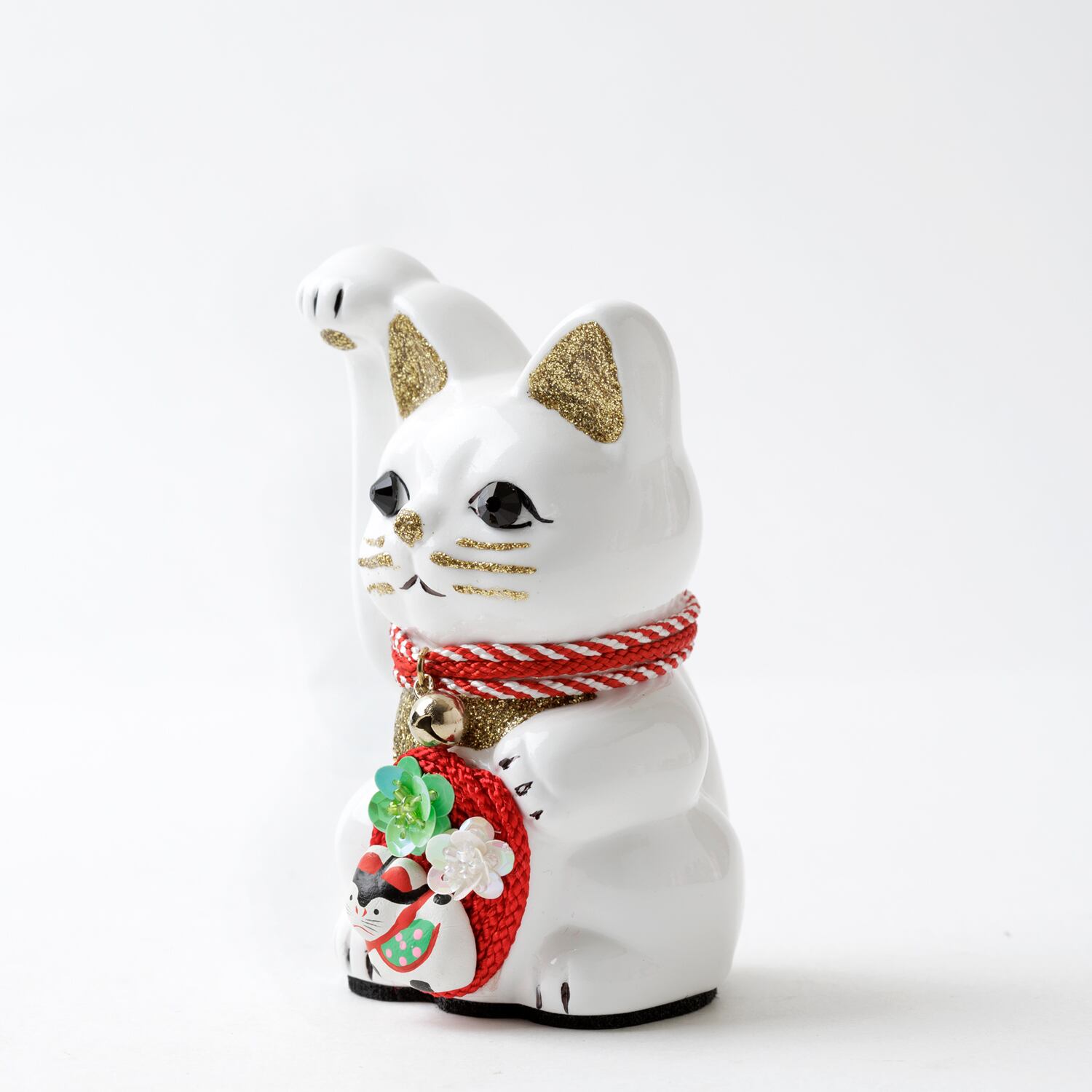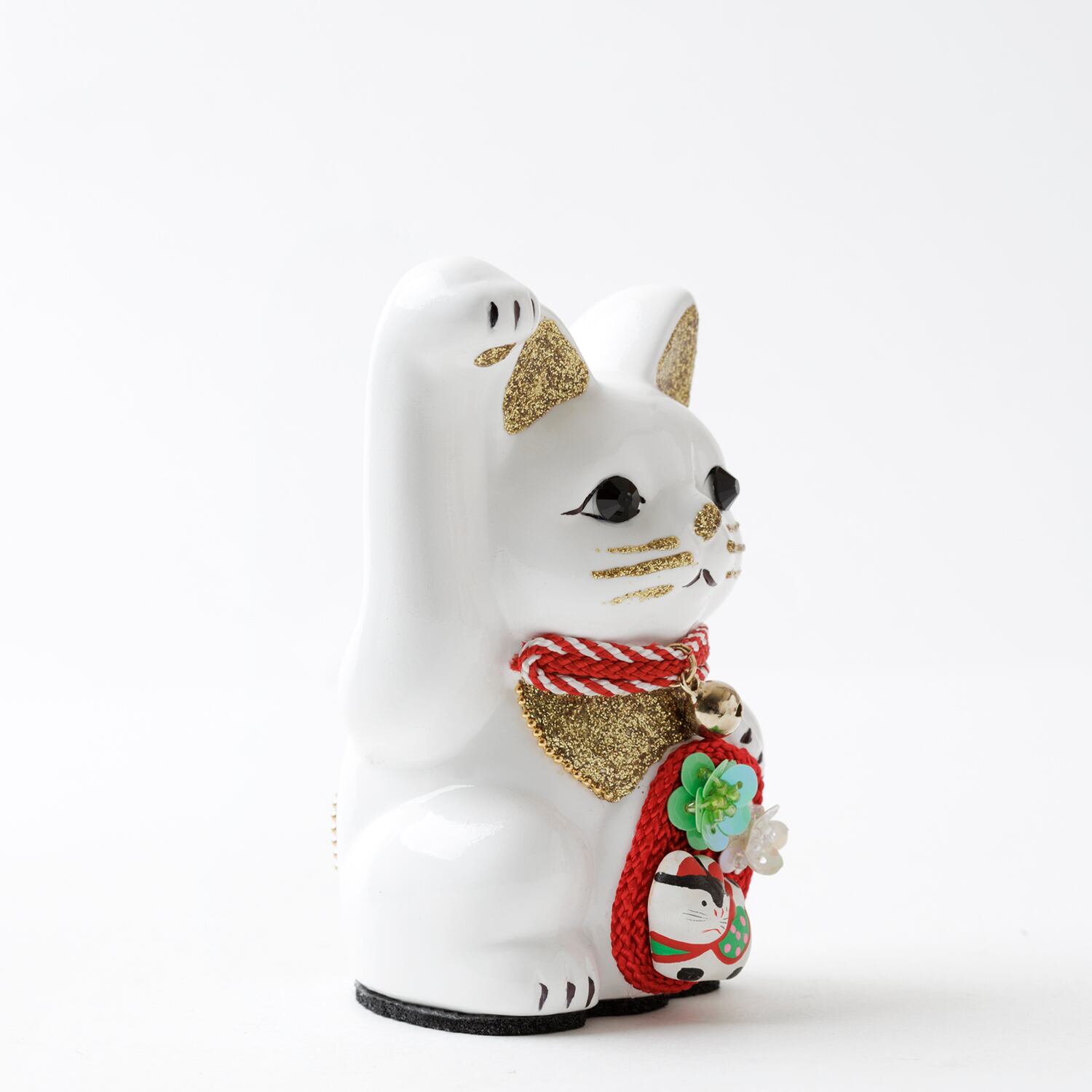 窯元から届く招き猫のベースに、さまざまなテイストのモチーフやパーツを組み合わせて、ひとつずつ、手作業でていねいに仕上げています。表情が若干異なるのも個性だとお考えください。