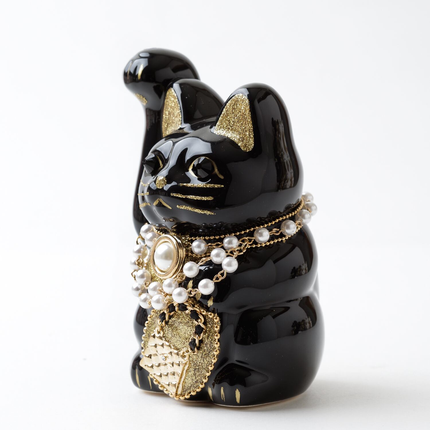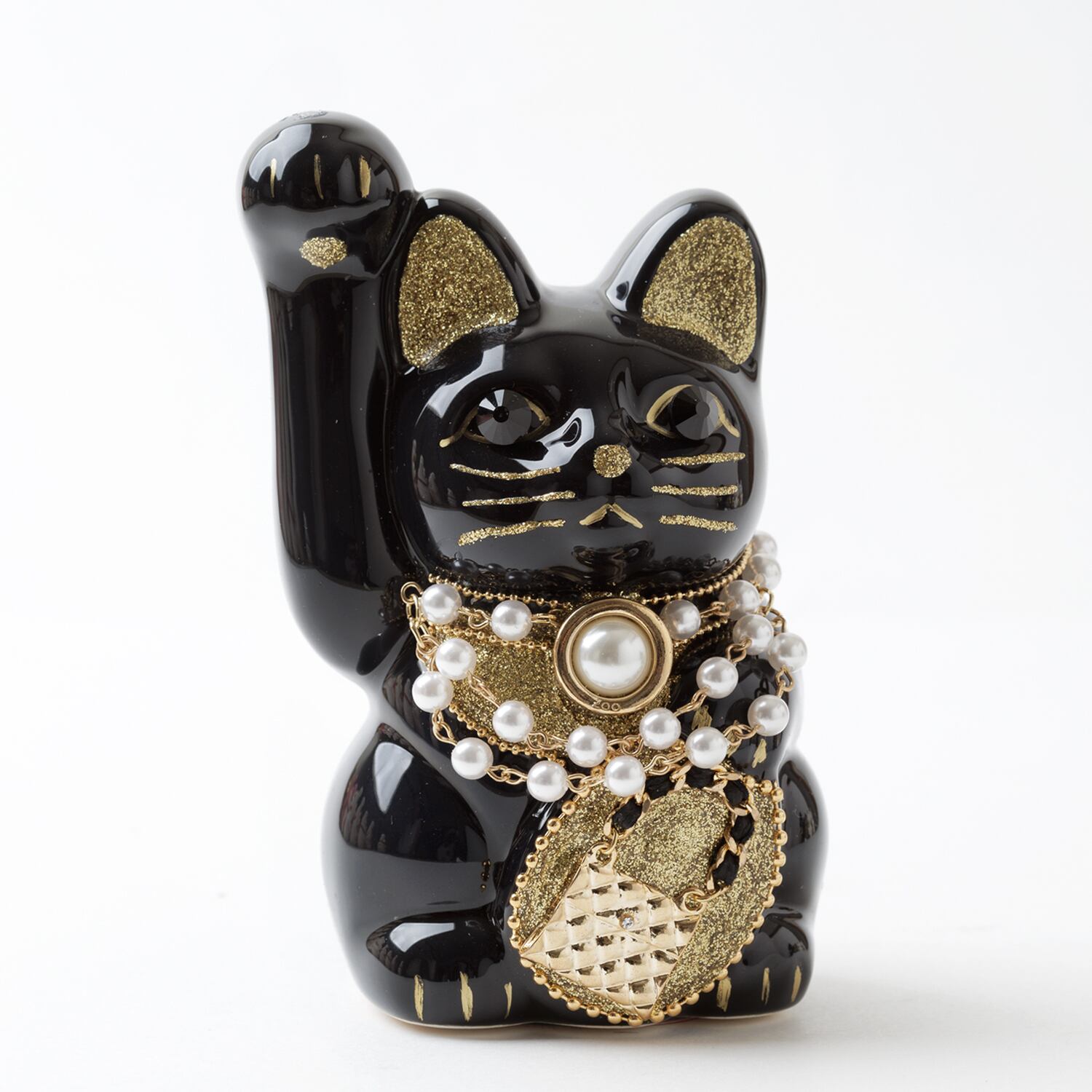 窯元から届く招き猫のベースに、さまざまなテイストのモチーフやパーツを組み合わせて、ひとつずつ、手作業でていねいに仕上げています。表情が若干異なるのも個性だとお考えください。