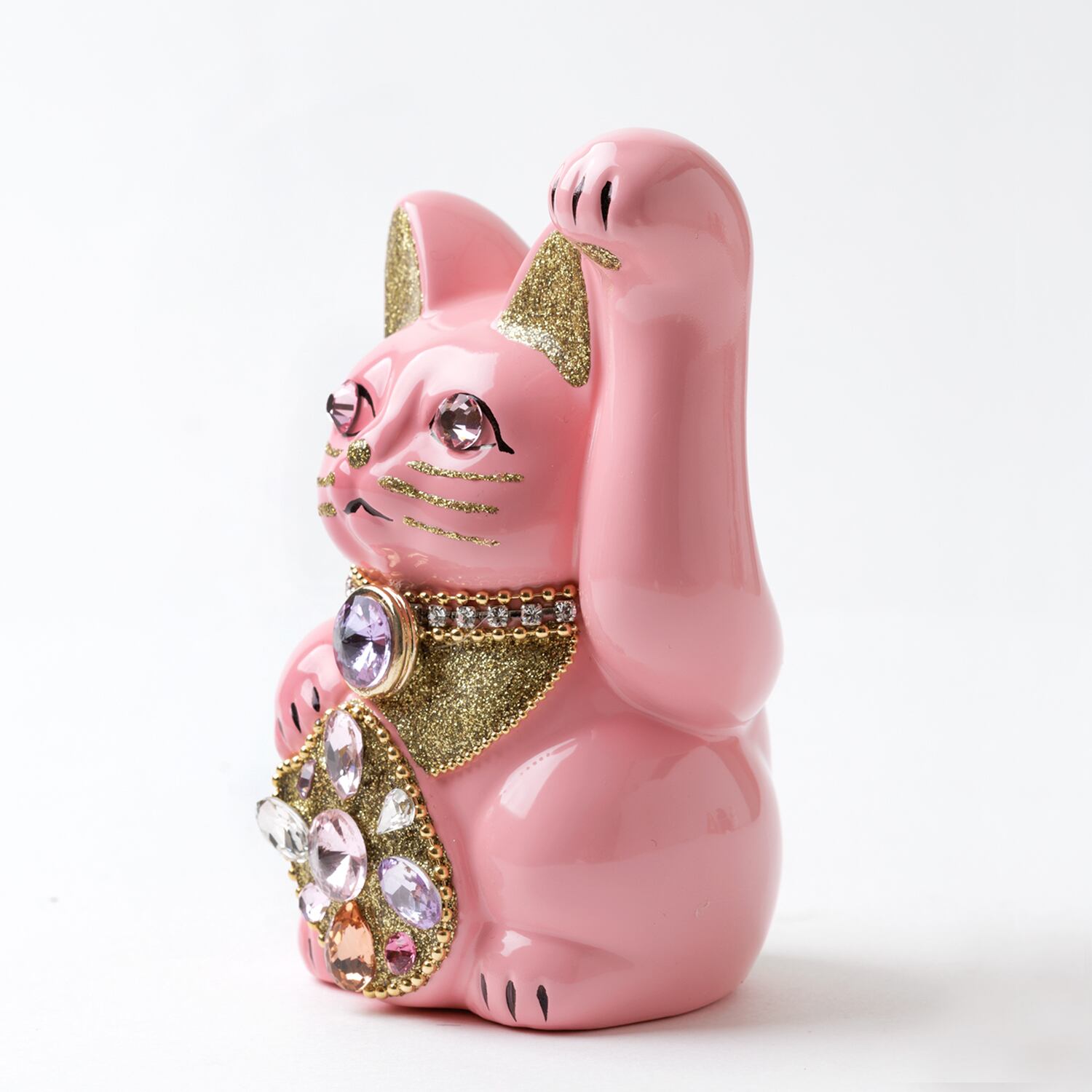 窯元から届く招き猫のベースに、さまざまなテイストのモチーフやパーツを組み合わせて、ひとつずつ、手作業でていねいに仕上げています。表情が若干異なるのも個性だとお考えください。