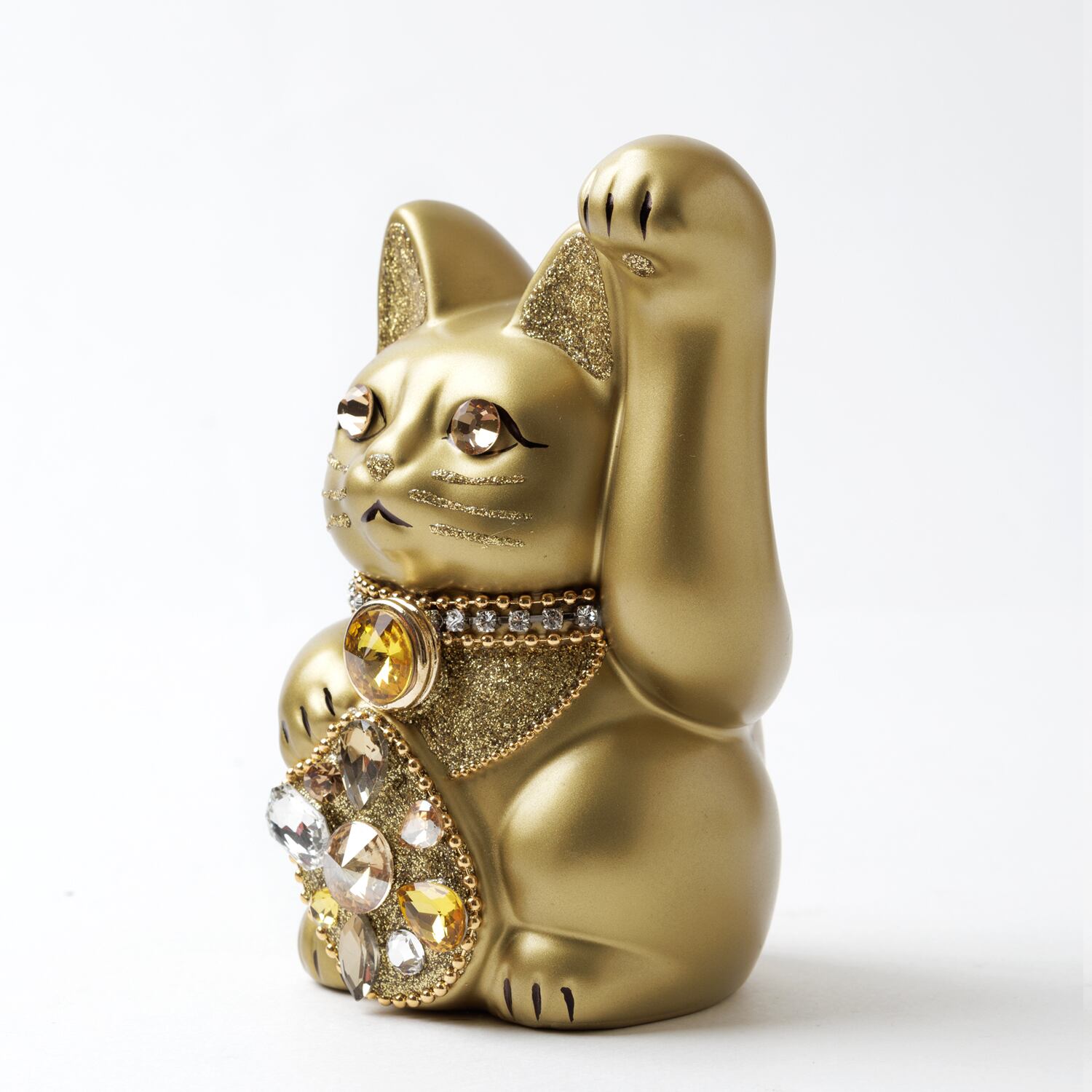 窯元から届く招き猫のベースに、さまざまなテイストのモチーフやパーツを組み合わせて、ひとつずつ、手作業でていねいに仕上げています。表情が若干異なるのも個性だとお考えください。