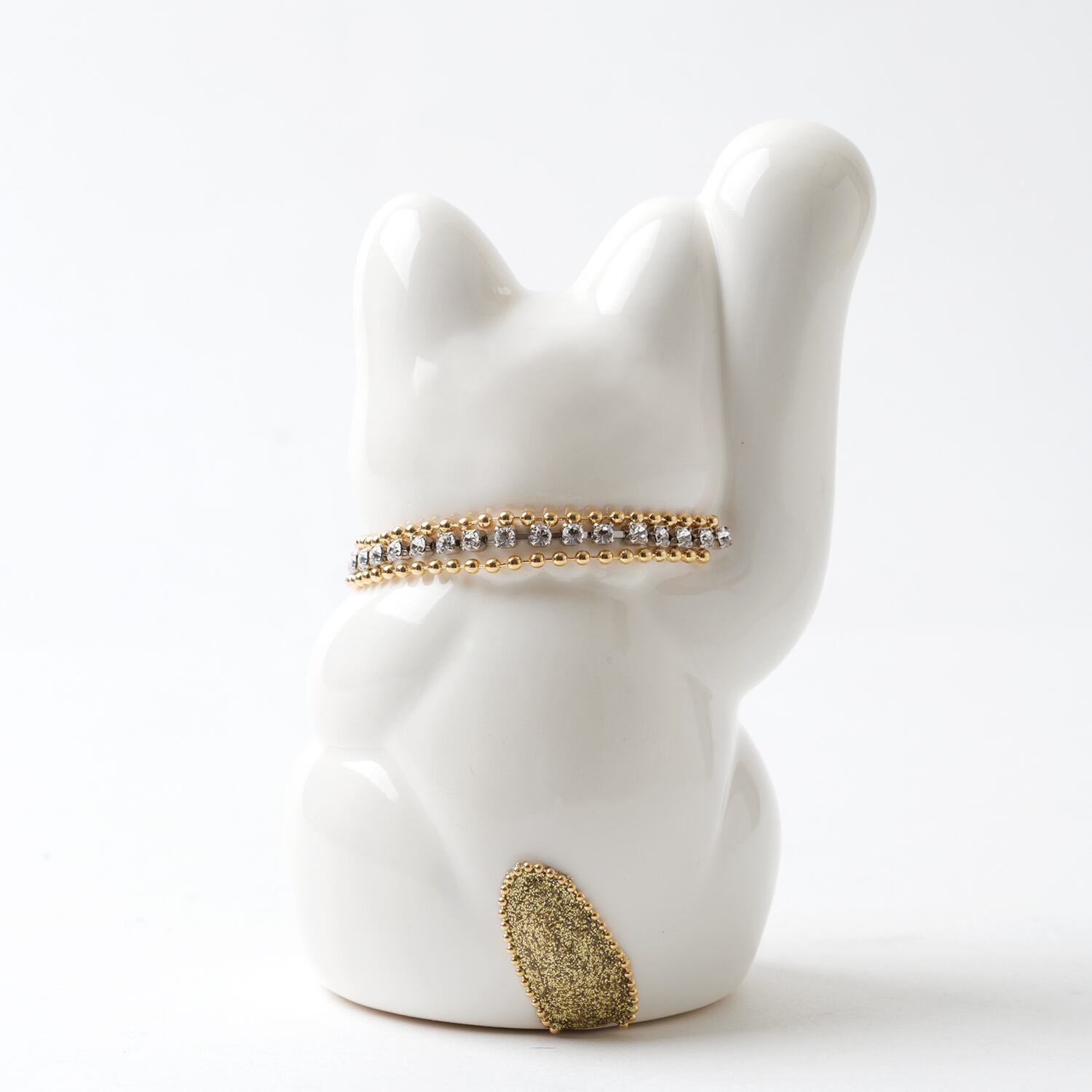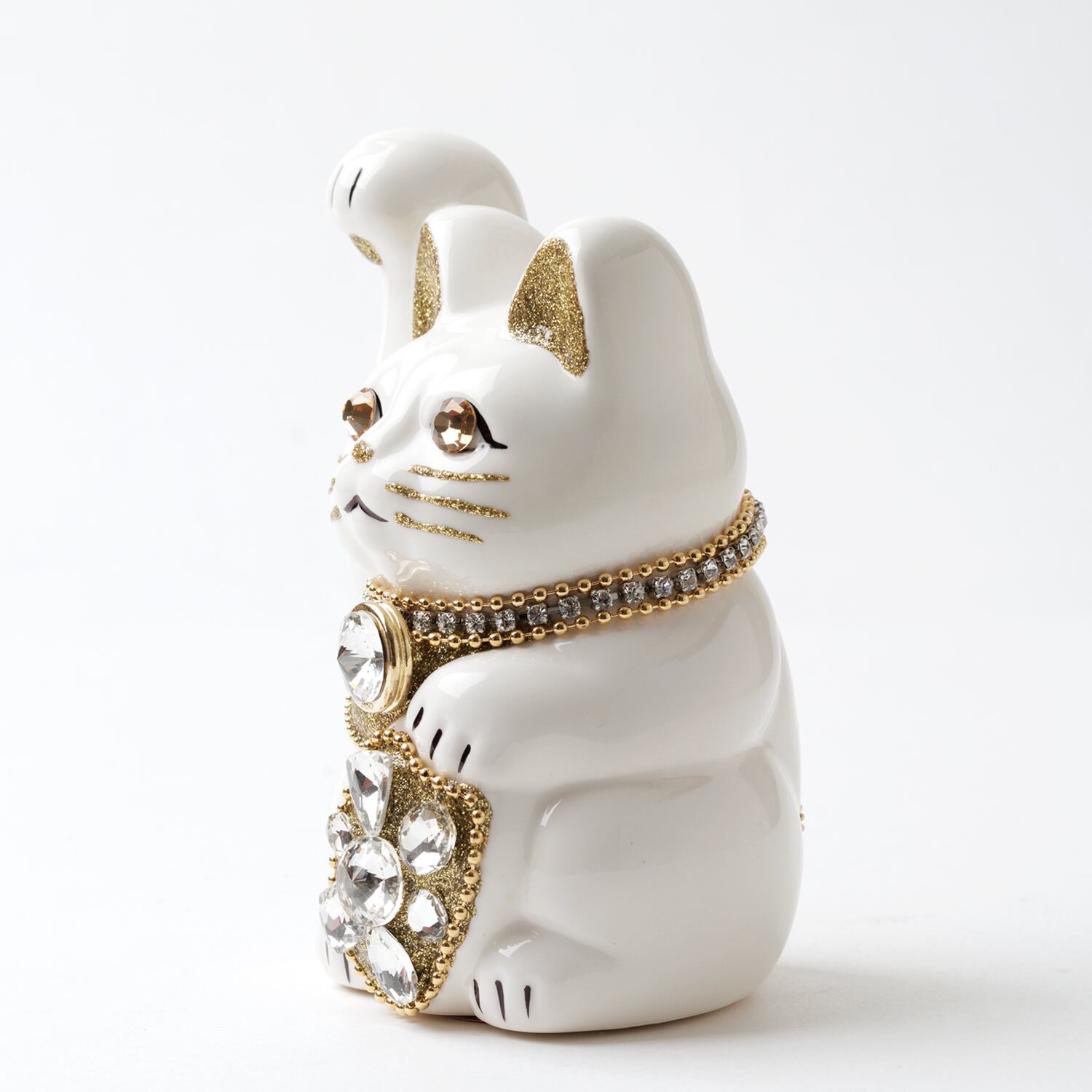 窯元から届く招き猫のベースに、さまざまなテイストのモチーフやパーツを組み合わせて、ひとつずつ、手作業でていねいに仕上げています。表情が若干異なるのも個性だとお考えください。