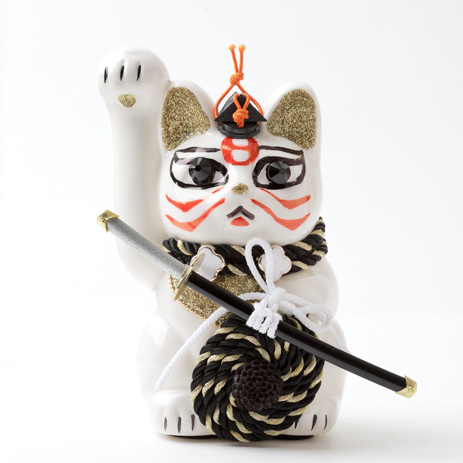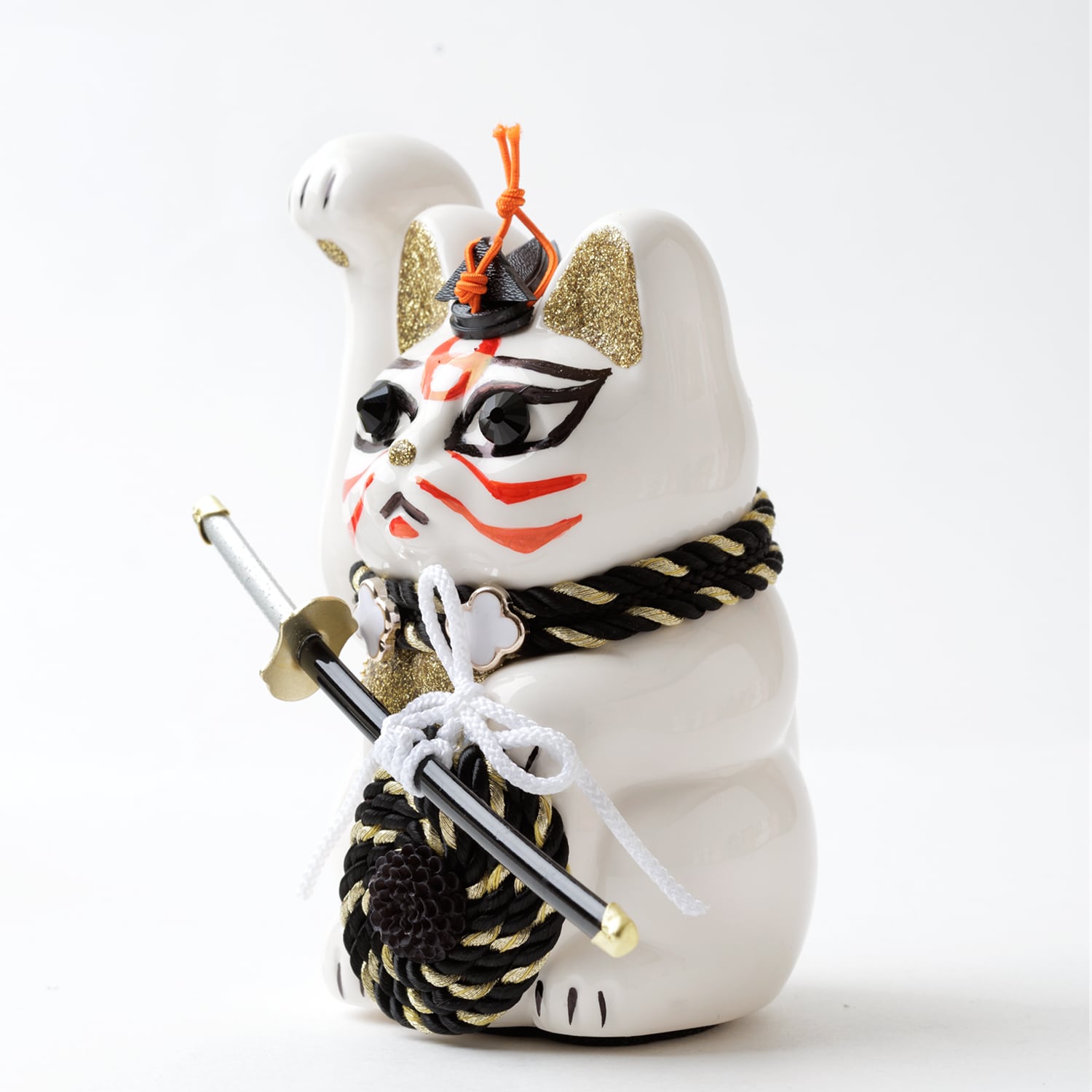 窯元から届く招き猫のベースに、さまざまなテイストのモチーフやパーツを組み合わせて、ひとつずつ、手作業でていねいに仕上げています。表情が若干異なるのも個性だとお考えください。