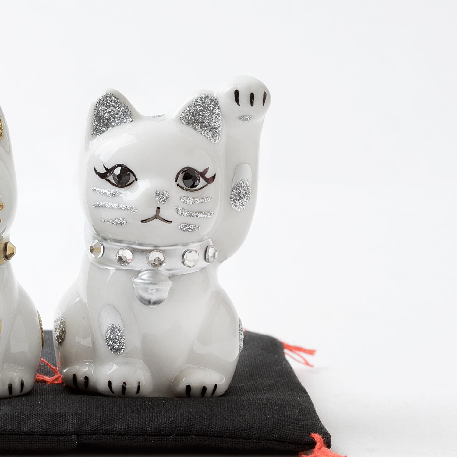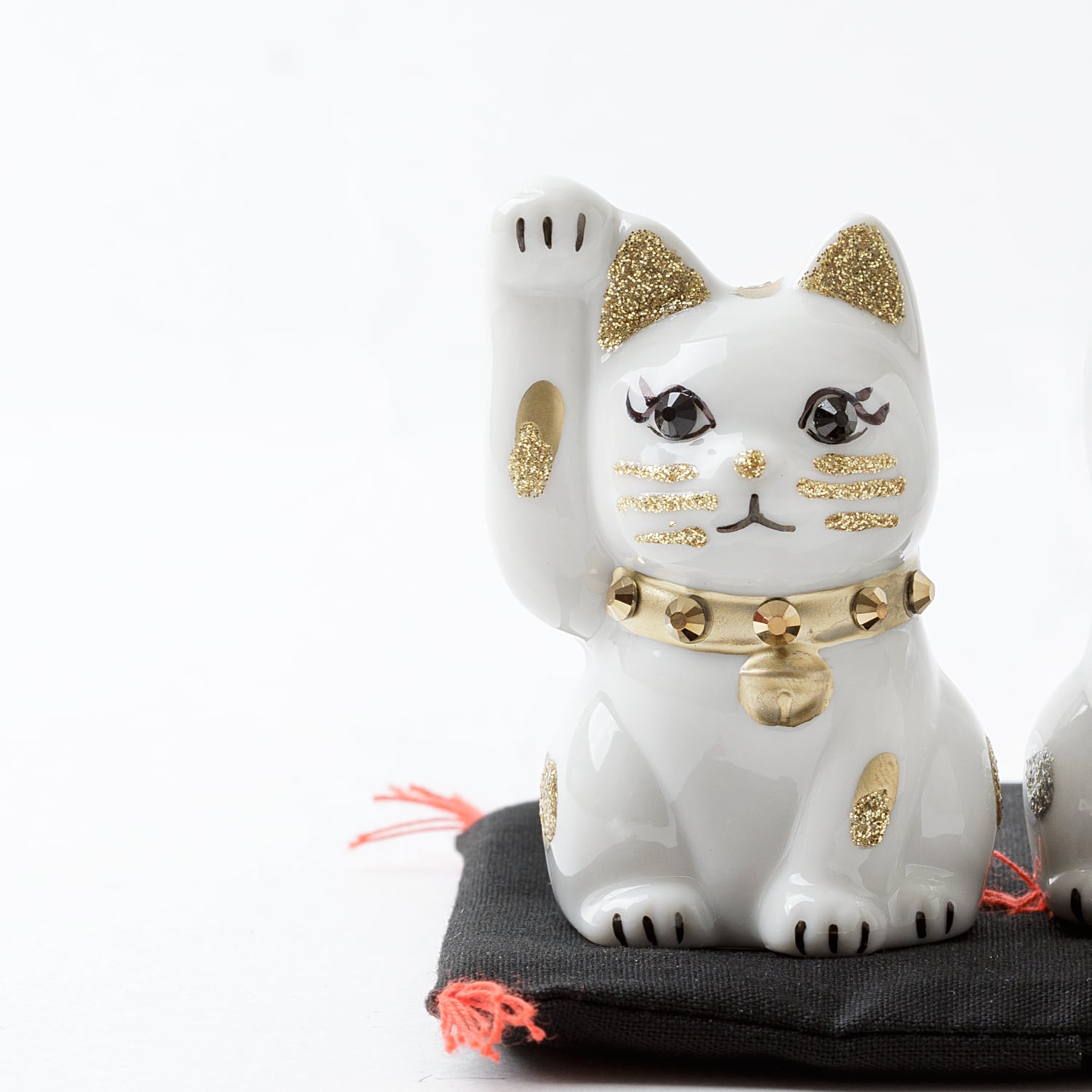 窯元から届く招き猫のベースに、さまざまなテイストのモチーフやパーツを組み合わせて、ひとつずつ、手作業でていねいに仕上げています。表情が若干異なるのも個性だとお考えください。