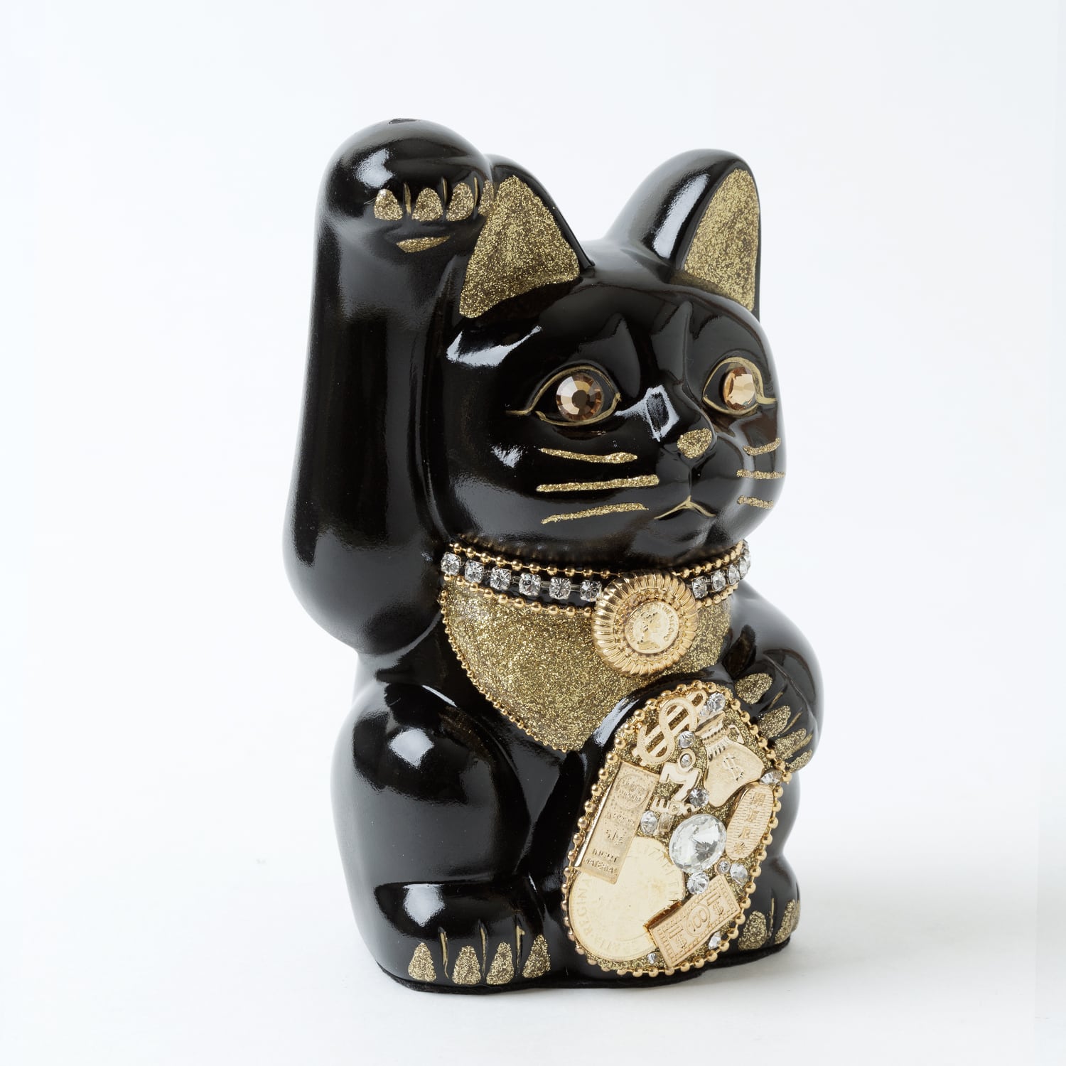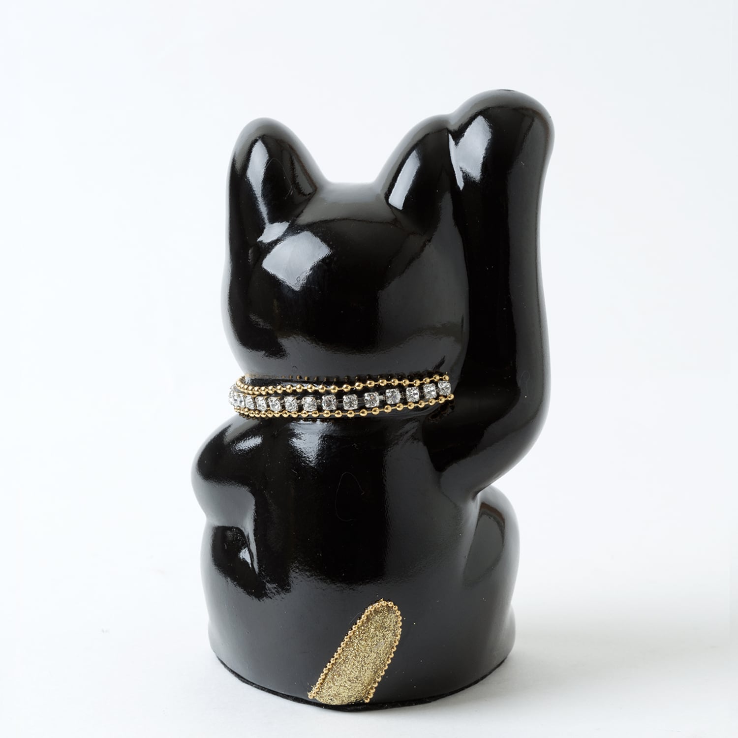 窯元から届く招き猫のベースに、さまざまなテイストのモチーフやパーツを組み合わせて、ひとつずつ、手作業でていねいに仕上げています。表情が若干異なるのも個性だとお考えください。