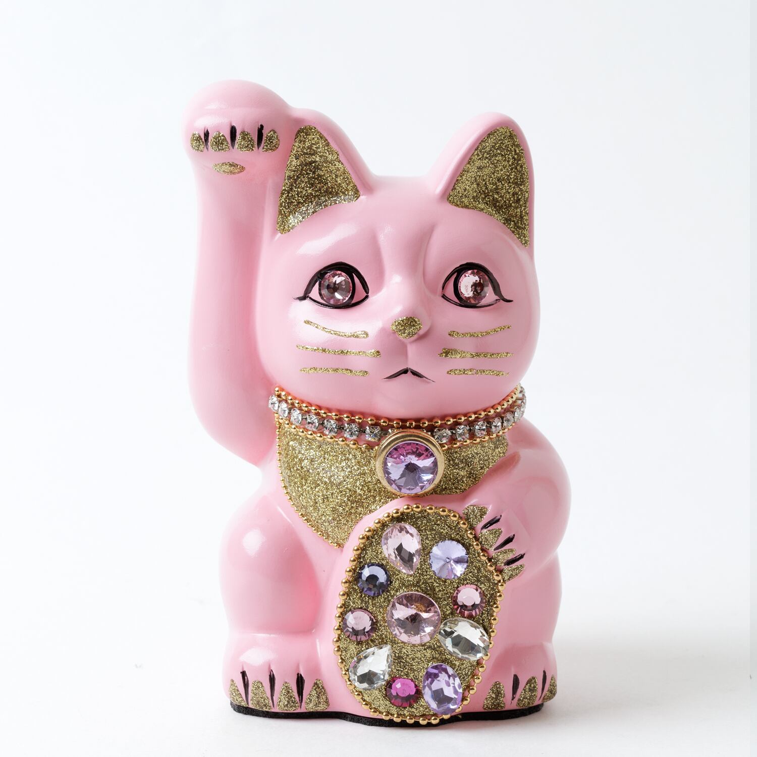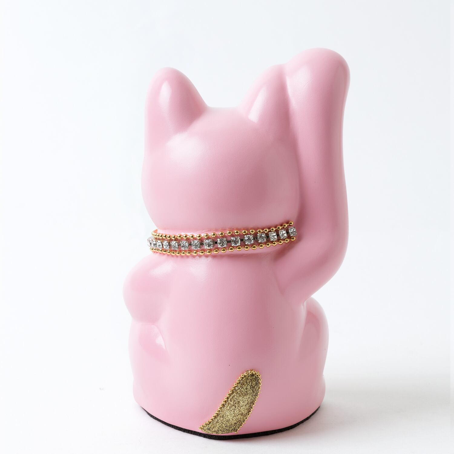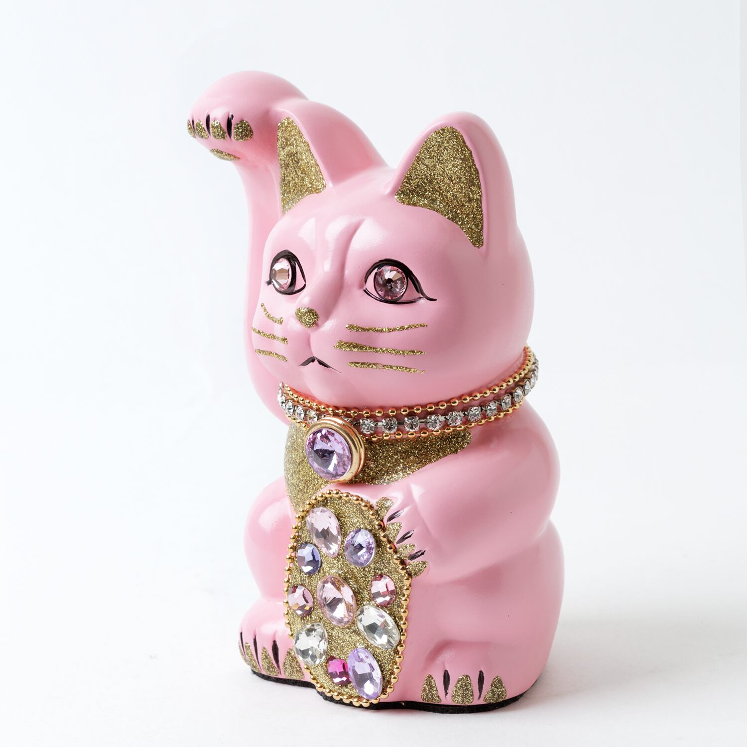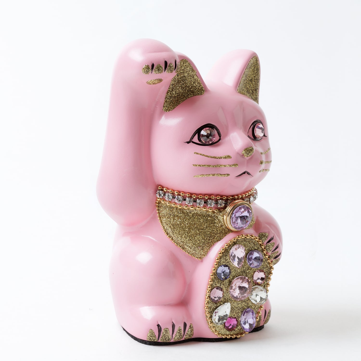 窯元から届く招き猫のベースに、さまざまなテイストのモチーフやパーツを組み合わせて、ひとつずつ、手作業でていねいに仕上げています。表情が若干異なるのも個性だとお考えください。