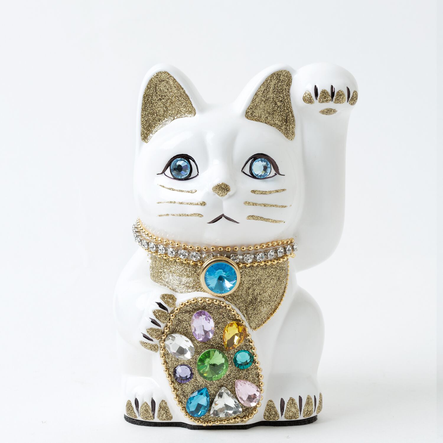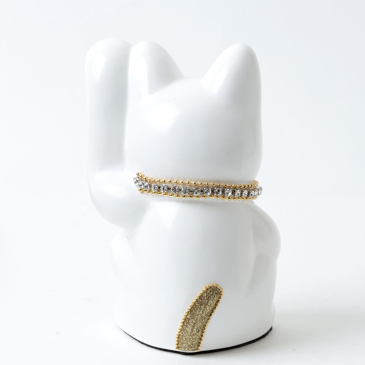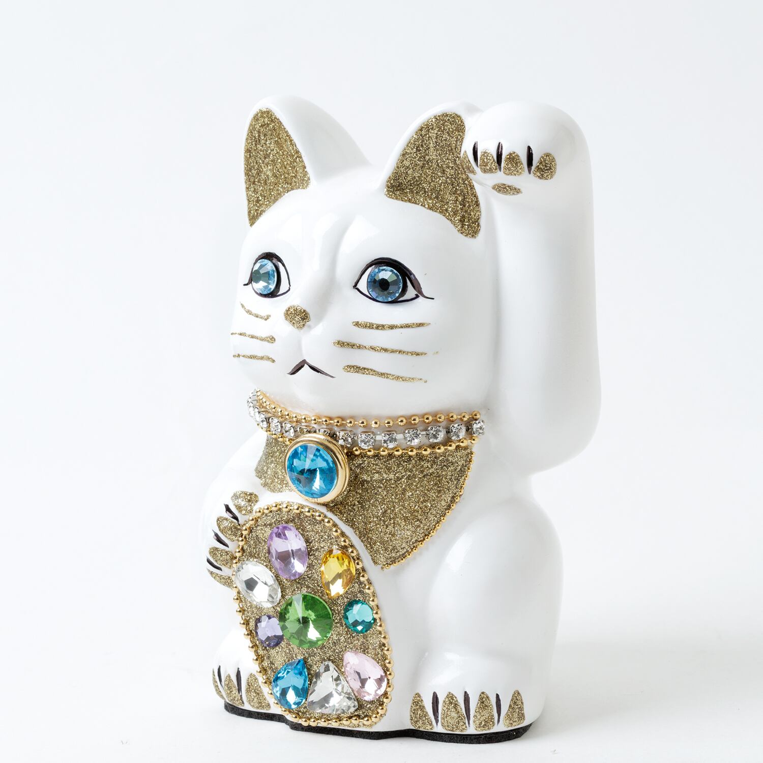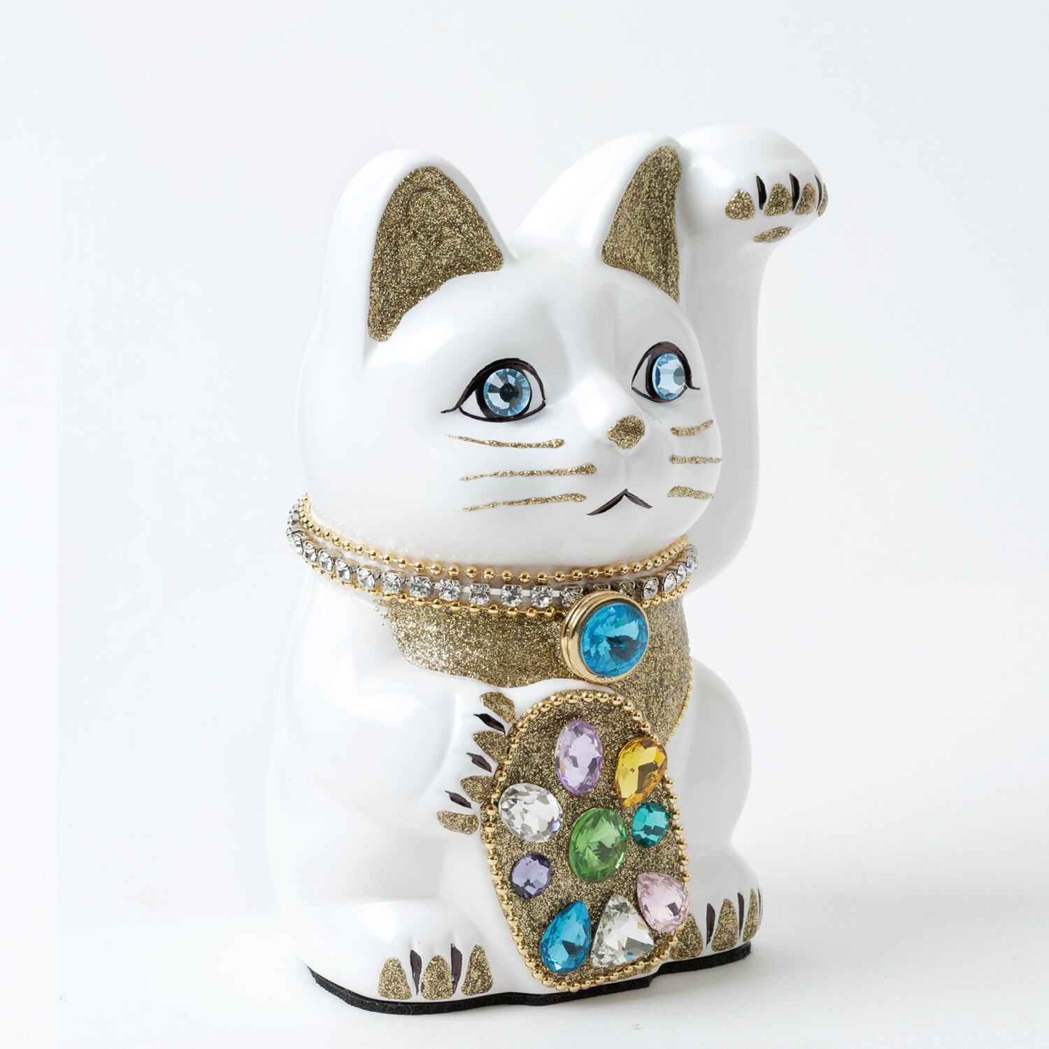 窯元から届く招き猫のベースに、さまざまなテイストのモチーフやパーツを組み合わせて、ひとつずつ、手作業でていねいに仕上げています。表情が若干異なるのも個性だとお考えください。