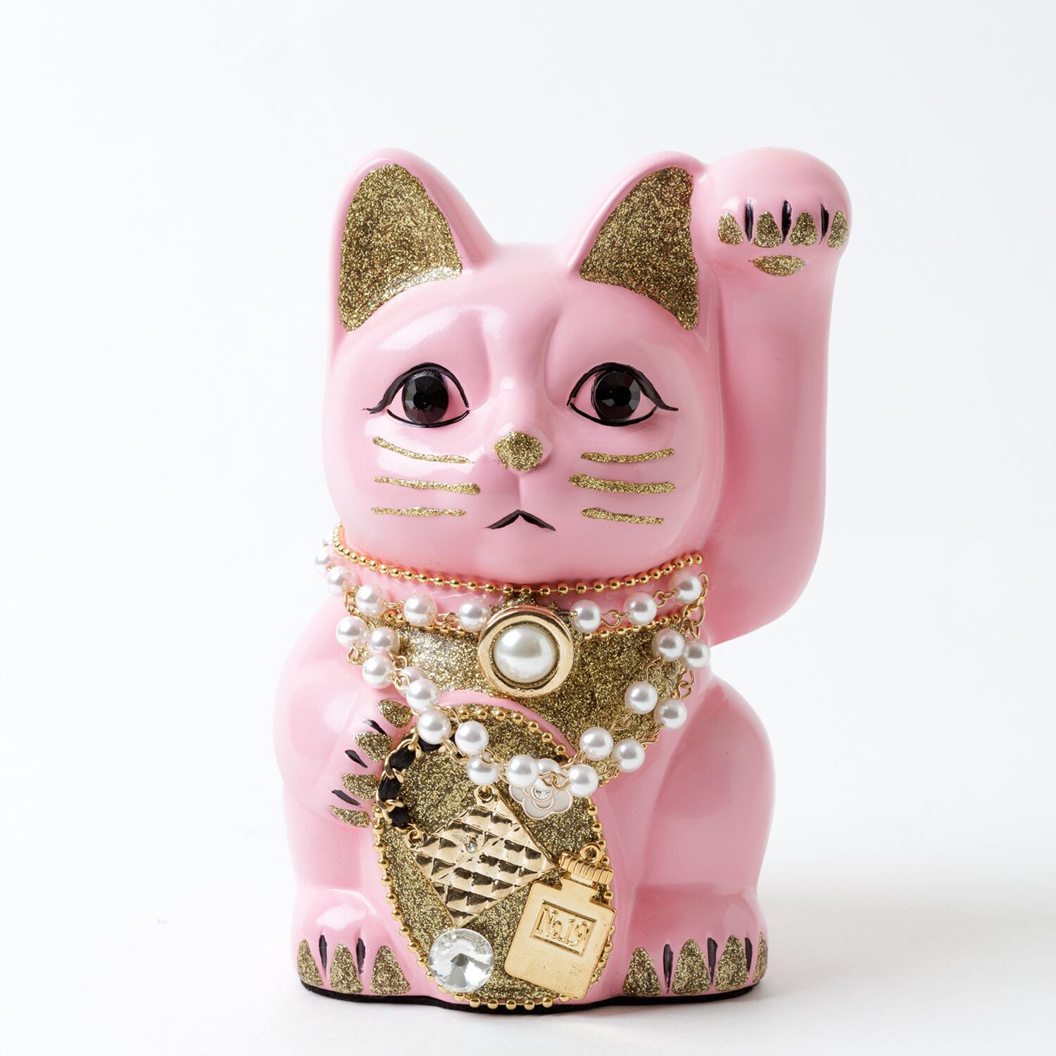 窯元から届く招き猫のベースに、さまざまなテイストのモチーフやパーツを組み合わせて、ひとつずつ、手作業でていねいに仕上げています。表情が若干異なるのも個性だとお考えください。