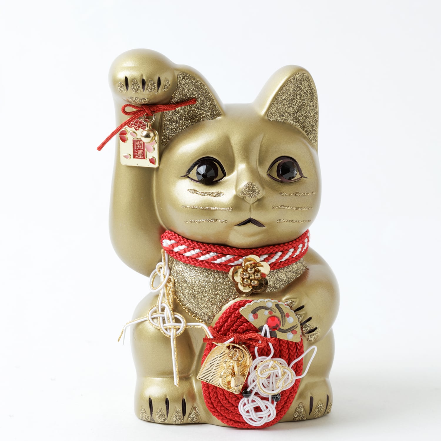 窯元から届く招き猫のベースに、さまざまなテイストのモチーフやパーツを組み合わせて、ひとつずつ、手作業でていねいに仕上げています。表情が若干異なるのも個性だとお考えください。