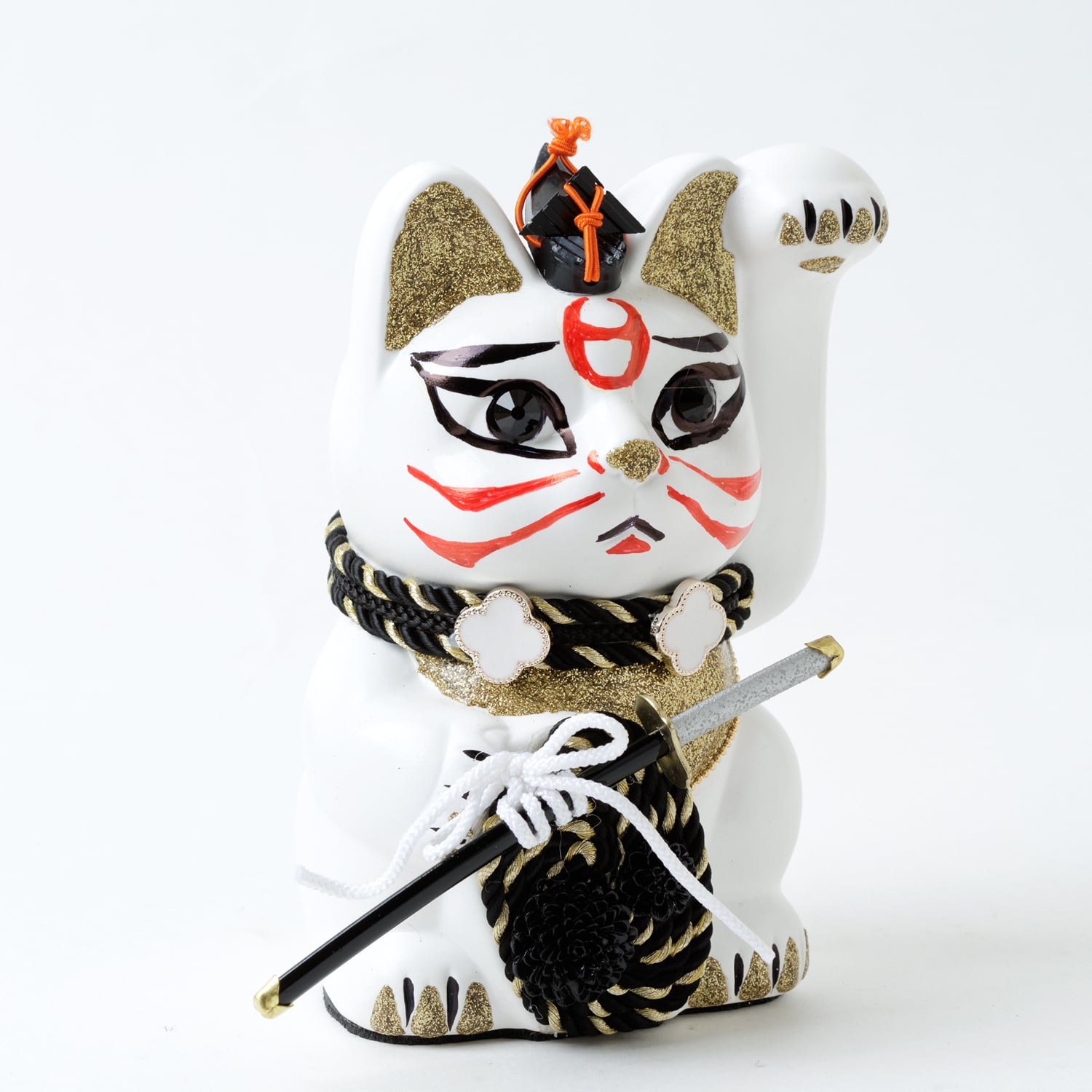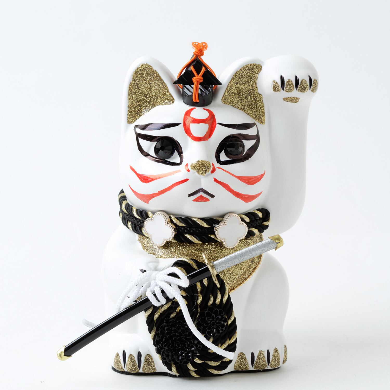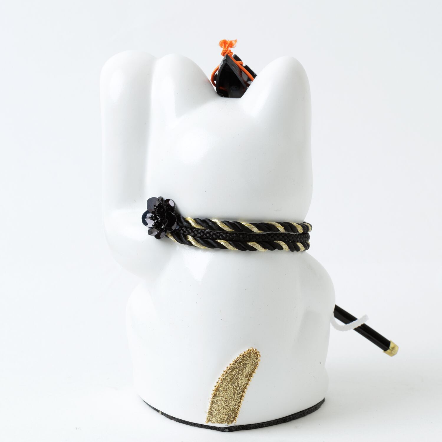 窯元から届く招き猫のベースに、さまざまなテイストのモチーフやパーツを組み合わせて、ひとつずつ、手作業でていねいに仕上げています。表情が若干異なるのも個性だとお考えください。
