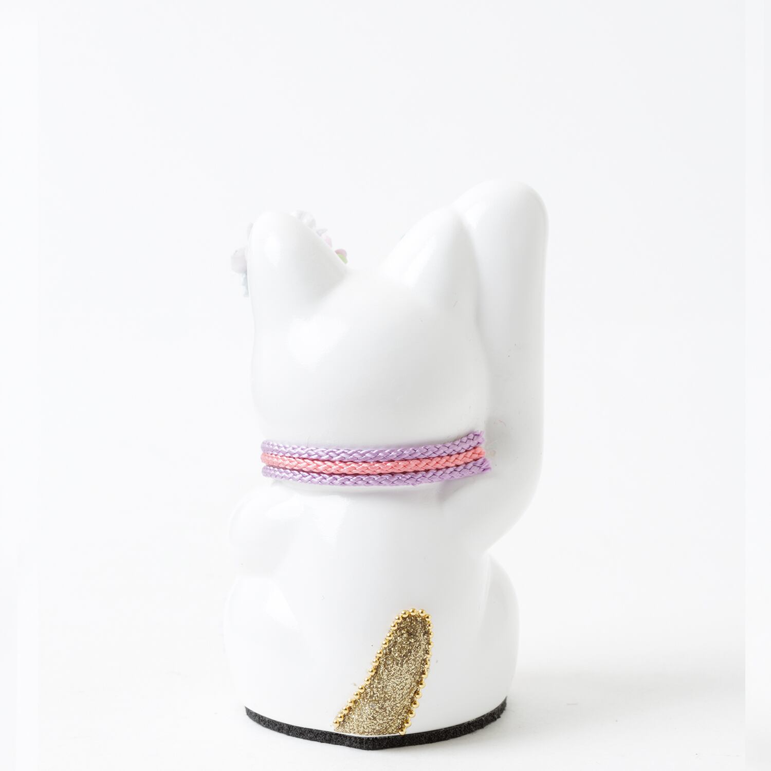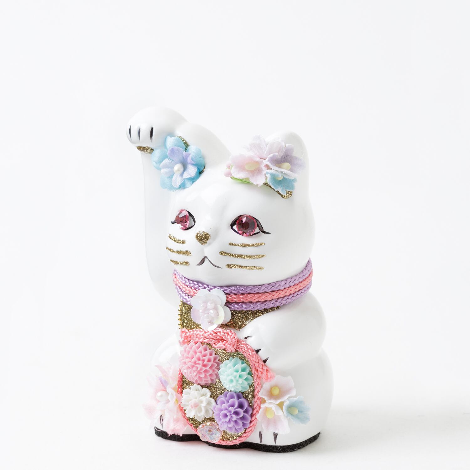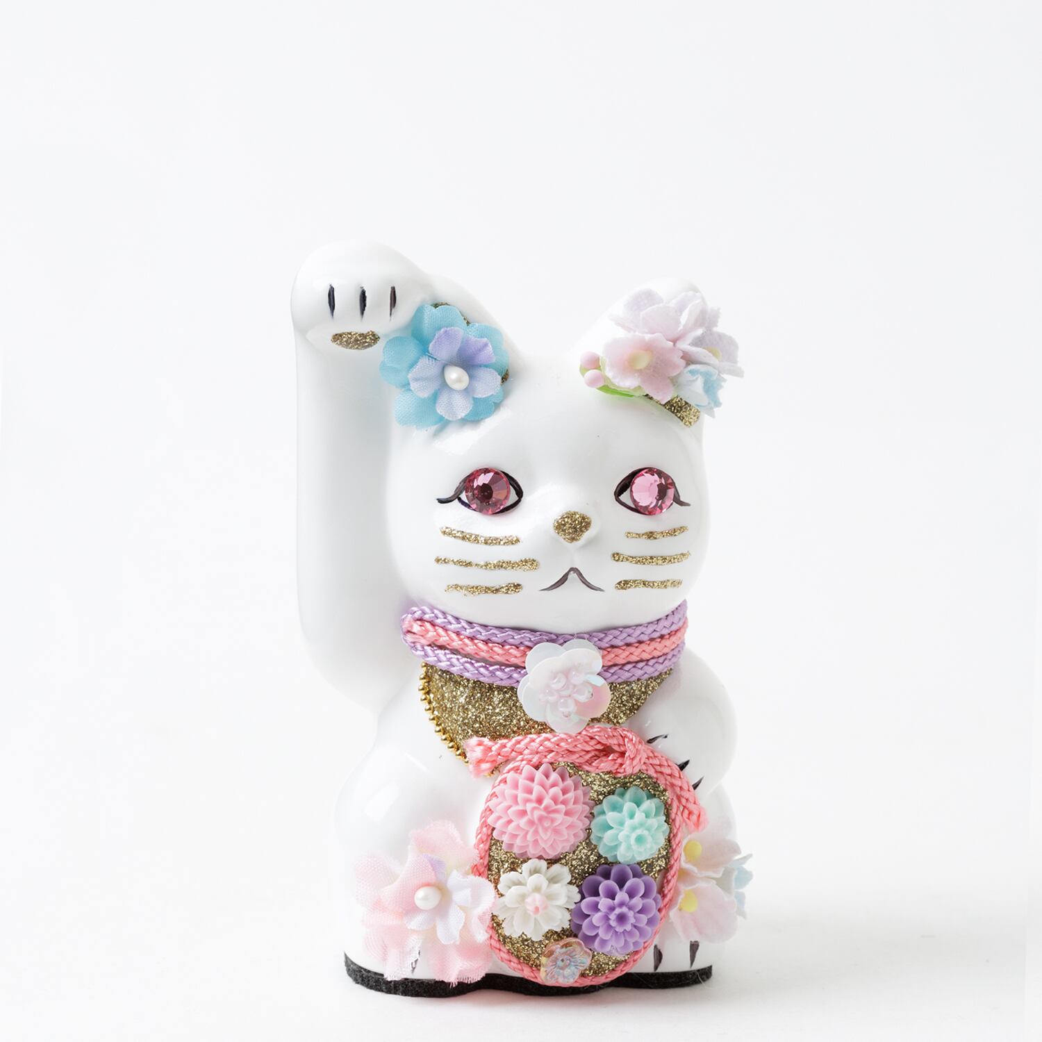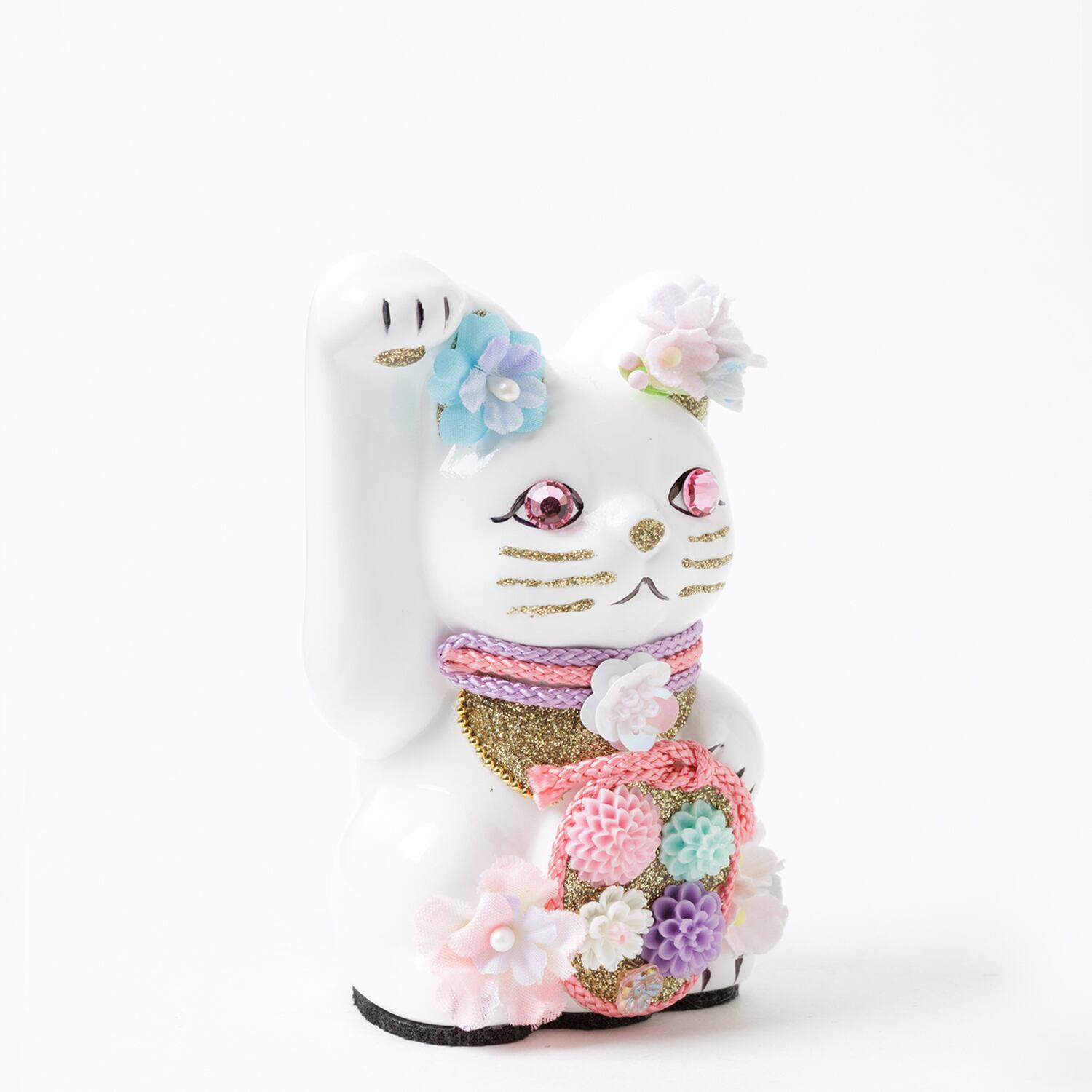 窯元から届く招き猫のベースに、さまざまなテイストのモチーフやパーツを組み合わせて、ひとつずつ、手作業でていねいに仕上げています。表情が若干異なるのも個性だとお考えください。