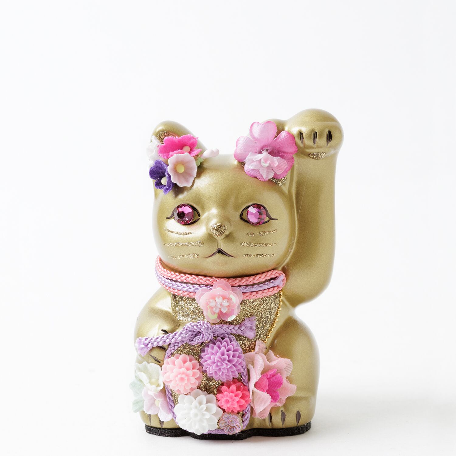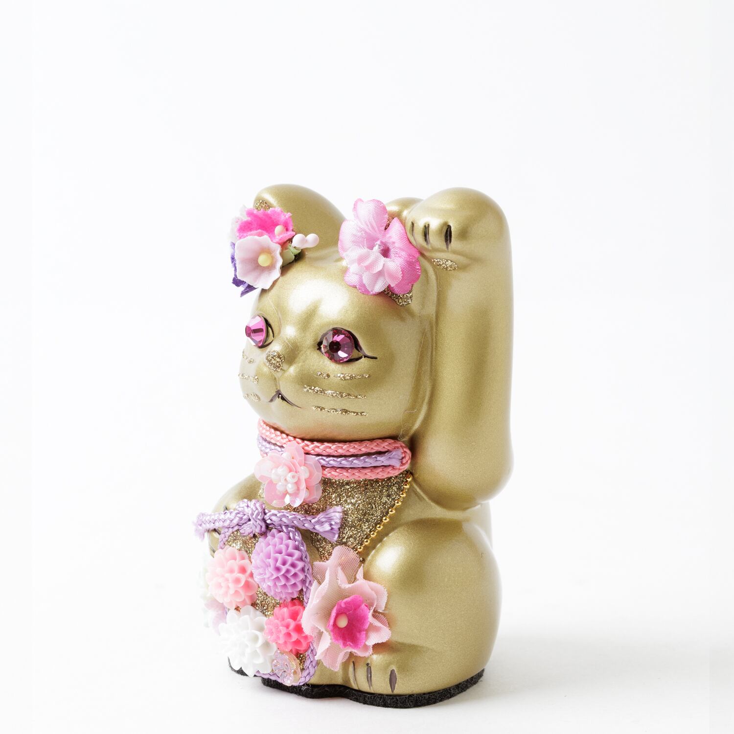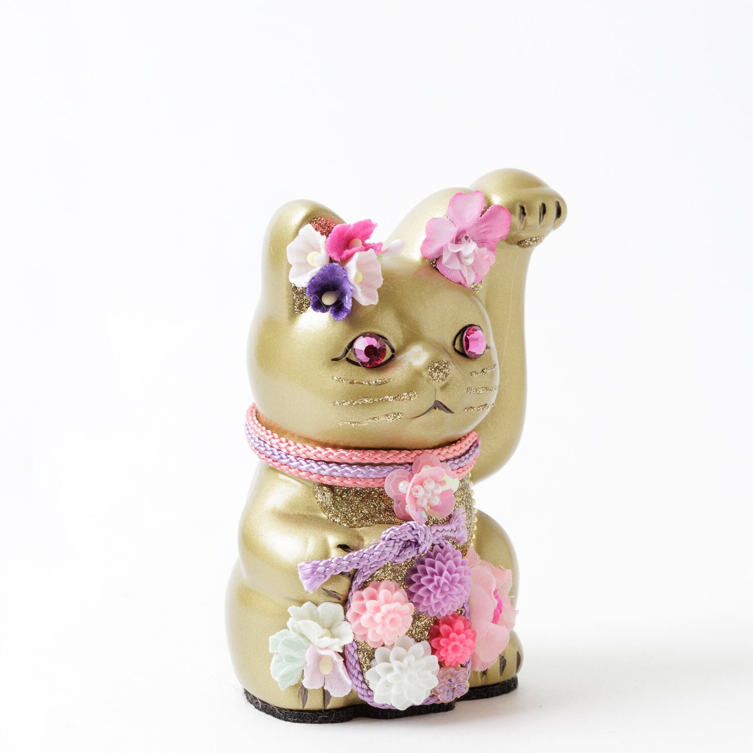 窯元から届く招き猫のベースに、さまざまなテイストのモチーフやパーツを組み合わせて、ひとつずつ、手作業でていねいに仕上げています。表情が若干異なるのも個性だとお考えください。