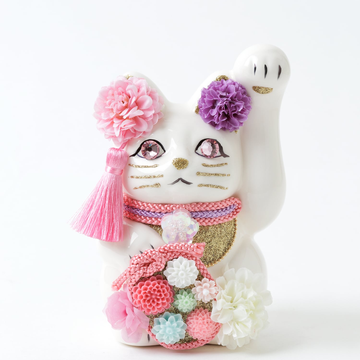 窯元から届く招き猫のベースに、さまざまなテイストのモチーフやパーツを組み合わせて、ひとつずつ、手作業でていねいに仕上げています。表情が若干異なるのも個性だとお考えください。